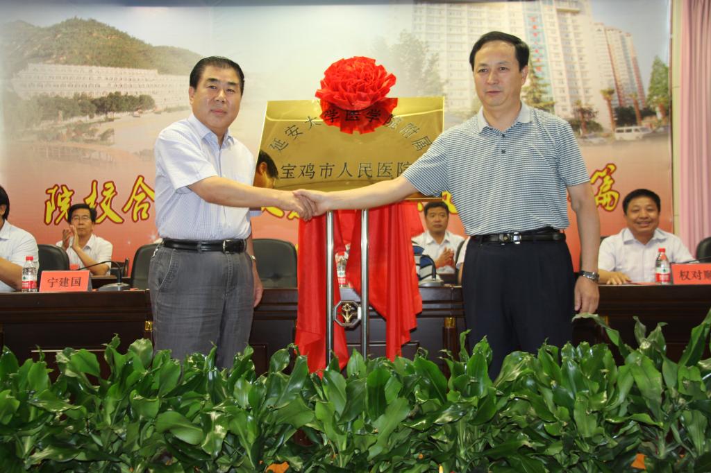 最后,韩继明院长和权对顺院长共同签署了延安大学与宝鸡市人民医院共建附属医院协议书;胡俊生副校长和宁建国局长共同为延安大学附属宝鸡市人民医院揭牌。