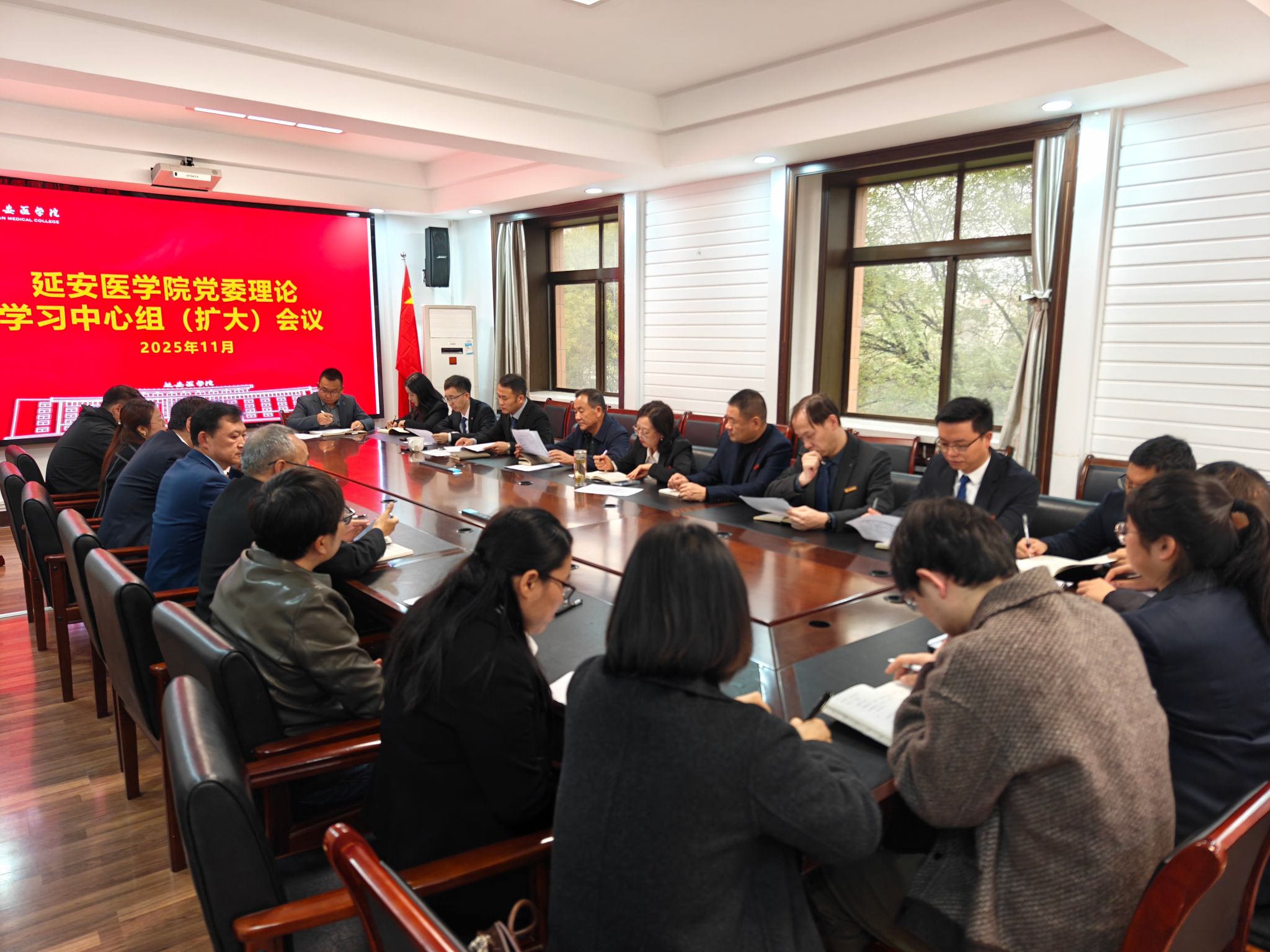 2025年11月5日上午,延安医学院党委召开党委中心组(扩大)学习会议,深入学习中国共产党第二十届中央委员会第四次全体会议精神,重点围绕《中共中央关于制定国民经济和社会发展第十五个五年规划的建议》中关于教育和卫生健康领域的内容展开研讨。学院党委书记葛彬主持会议。