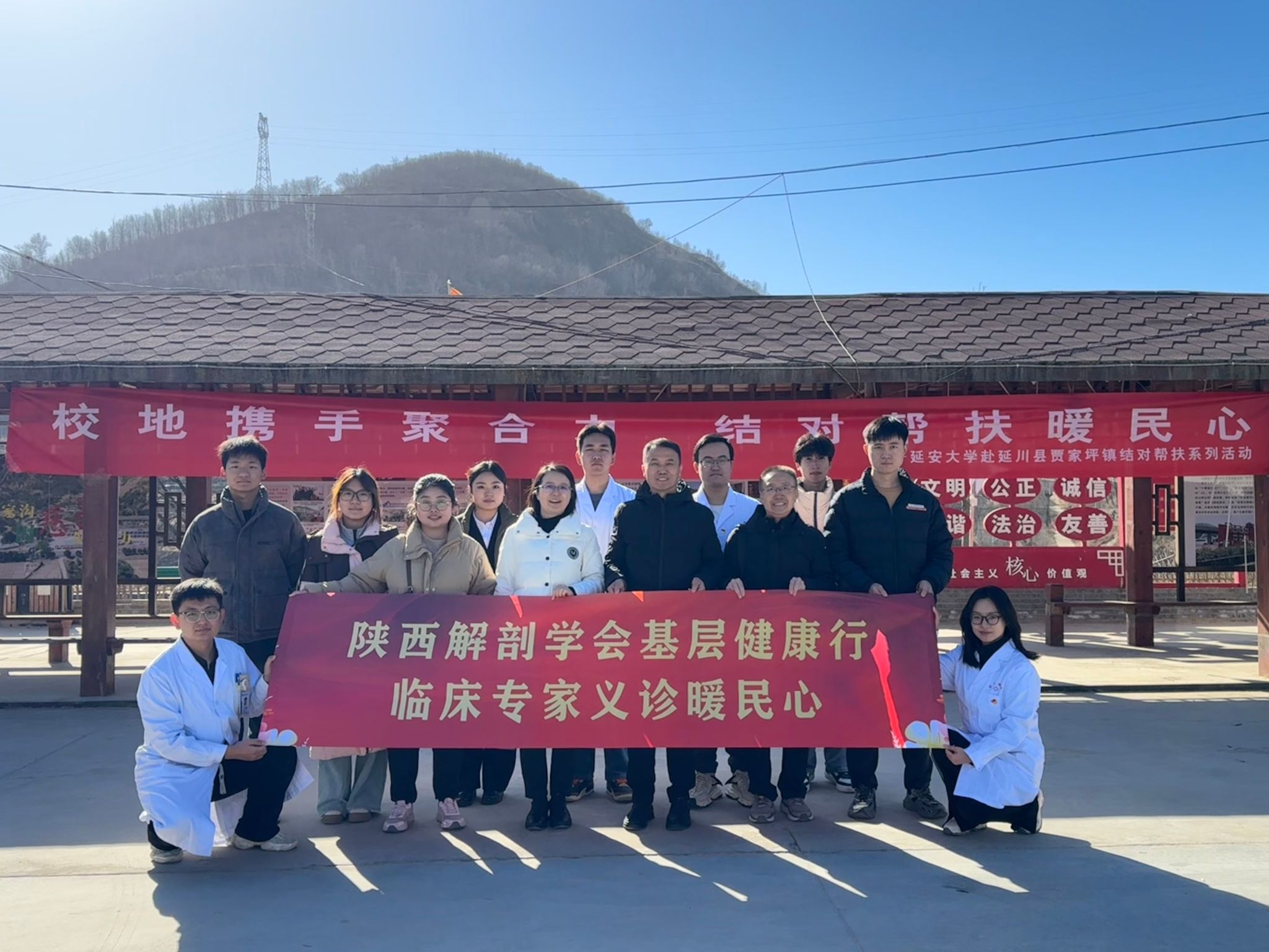 学院党委副书记高曙光,教师代表杨加周、严盼盼,延安大学“白求恩”医疗服务队、“红衣先锋队”队员及附属医院专家共同组成医疗团队,现场向贾家坪镇捐赠医学图书与常用医疗物资。医疗队聚焦群众“急难愁盼”,为闻讯而来的村民提供健康咨询、基础体检与疾病防治指导,并免费发放常用药品,把优质医疗资源送到百姓“家门口”。