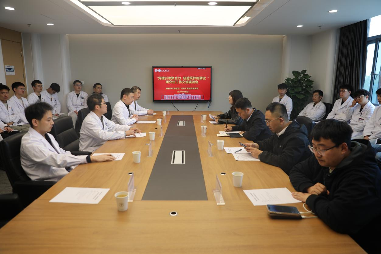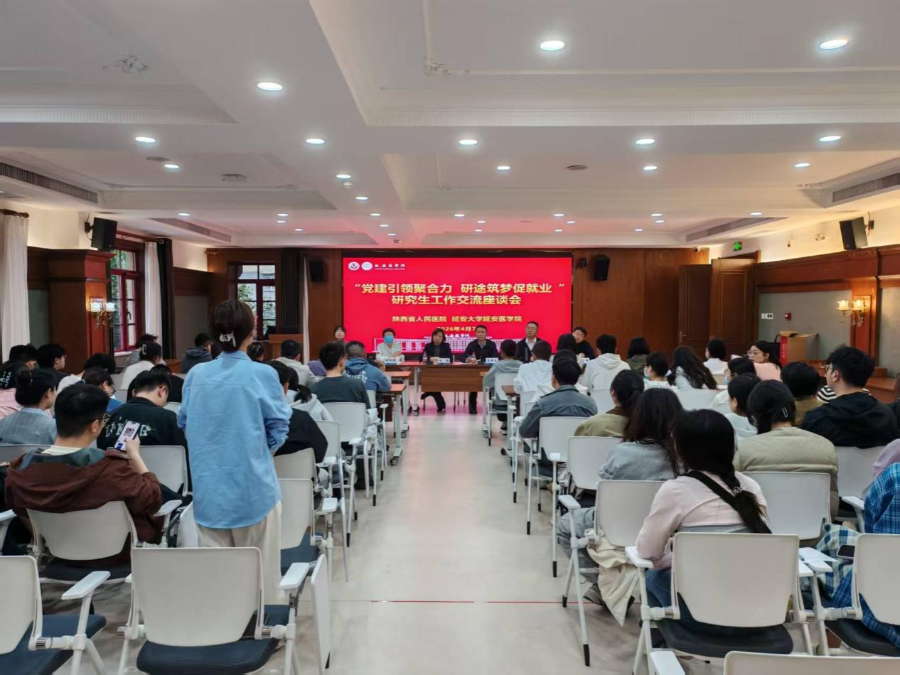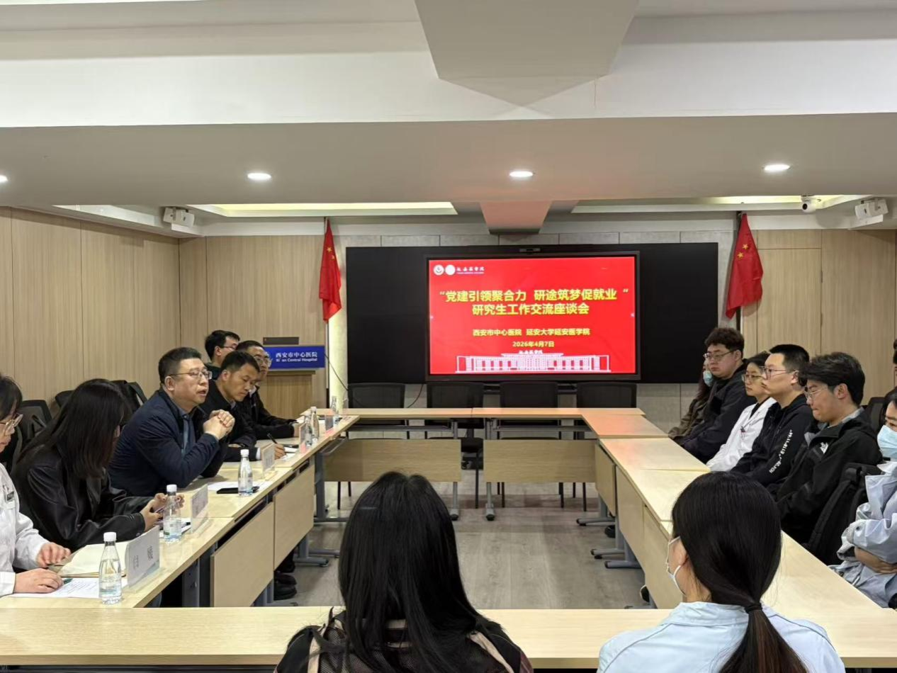 2026年4月7日至8日,延安大学延安医学院党委副书记高曙光带队,学工办副主任陈飞及辅导员祁迪、孙许腾一行,先后赴陕西省人民医院、西安市中心医院、西安市红会医院、延安大学咸阳医院四家规培基地,开展以“党建引领聚合力,研途筑梦促就业”为主题的系列交流座谈活动。