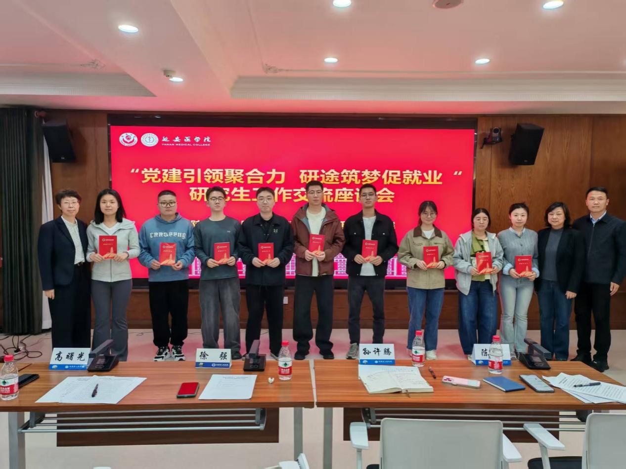 座谈会上各医院领导代表医院对表示欢迎,对学院长期以来的支持与信任表示感谢,并介绍了医院研究生培养情况。祁迪老师介绍了延安医学院的发展概况、研究生培养情况,陈飞老师介绍了“双百”研究生支部申报创建情况。孙许腾老师通报了2026年延安医学院研究生就业整体情况及就业工作的注意事项。期间与会领导为各基地党员同志颁发了政治生日卡,强化异地党员的身份认同和责任意识,激励他们继续发挥先锋模范作用。在自由交流环节,双方围绕研究生规培期间的党建品牌共建,就业工作推进,日常教育管理、安全稳定保障等方面展开交流。