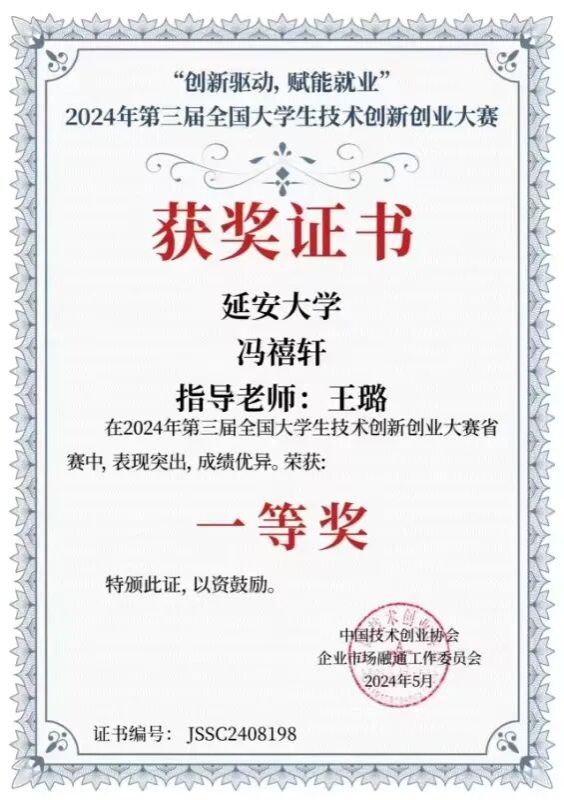 祝贺我院学子冯禧轩团队在第三届全国大学生技术创新创业大赛获得三等奖