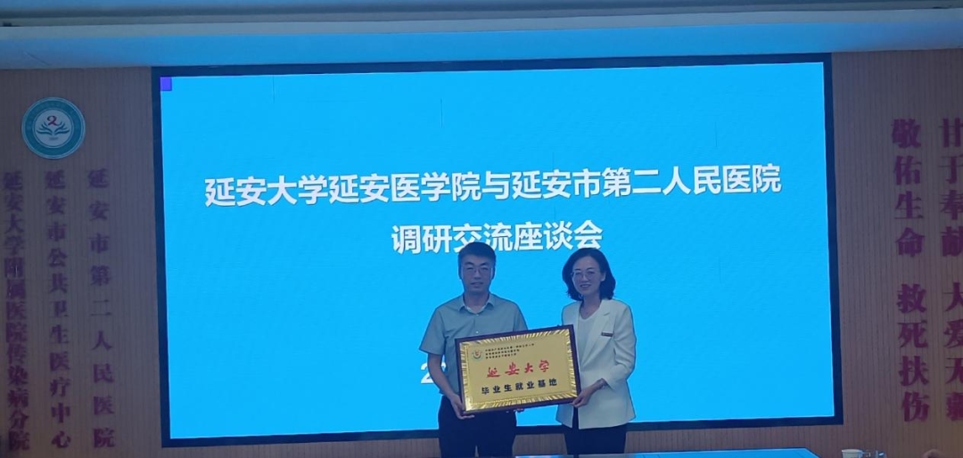 在与会人员的共同见证下,双方举行了“延安大学毕业生就业基地”签约授牌仪式。此次签约标志着延安市第二人民医院正式成为延安大学毕业生就业基地,未来将为学院学生提供更多实习实践机会,并优先吸纳优秀毕业生就业,进一步拓宽毕业生就业渠道,助力医疗卫生人才队伍建设。